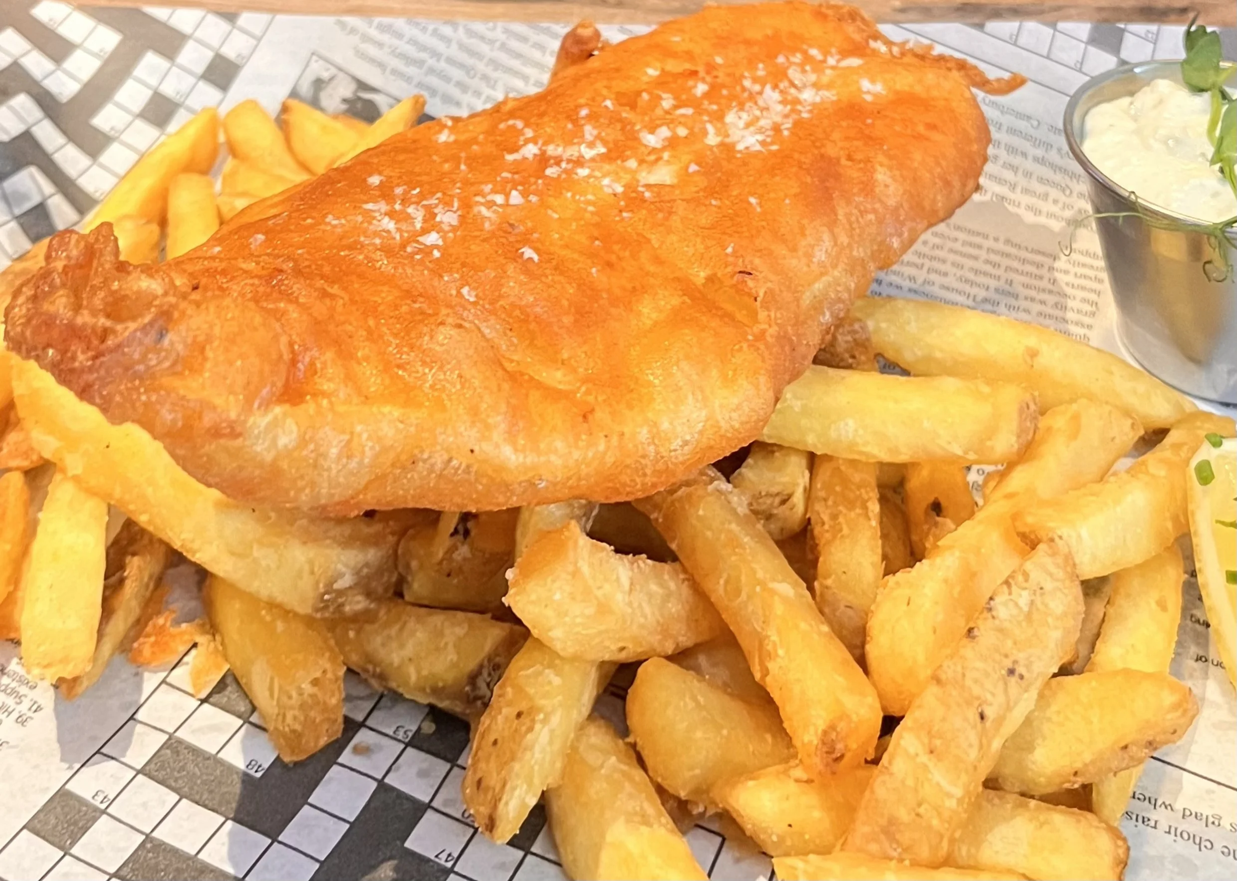 Peterhead Haddock Fish and Chips. Crispy, gluten free batter, mushy peas, tartare sauce and Koffman chips £13.95